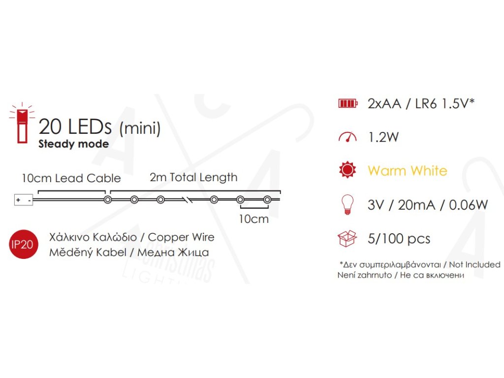 Dekorációs lánc, ideális kisebb dekorációk, füzérek világításához és mindenhol, ahol nem lehet bedugni a kábelt.