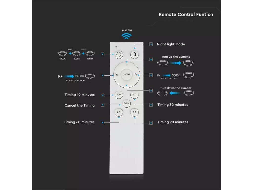 - Távirányítóval (2xAAA elem - a csomag nem tartalmazza) - fényszínszabályozás meleg fehértől hideg fehérig, időzítő és fényerő szabályozás.