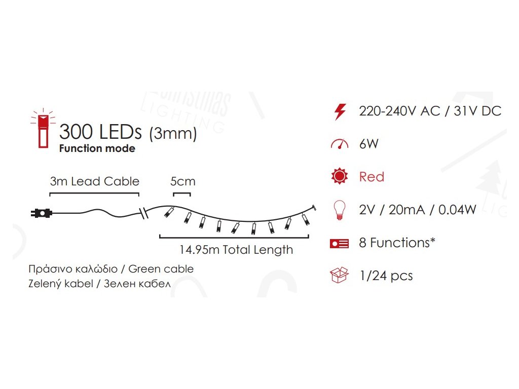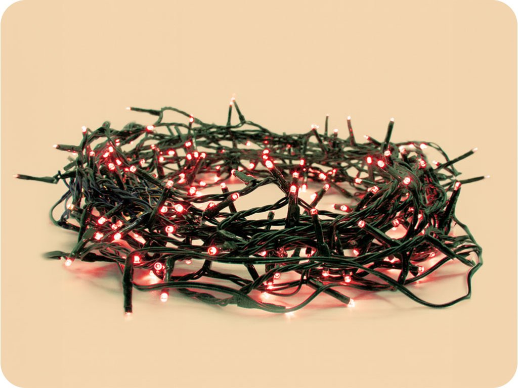 LED kültéri karácsonyi lánc, 300 LED, 14,95m, 3m vezeték, 8 funkció, IP44, piros [X08300412]
